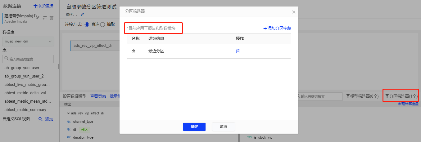 - 模型中没有隐藏的分区字段,生成的图表默认带上该分区筛选器且默认选择最近分区;