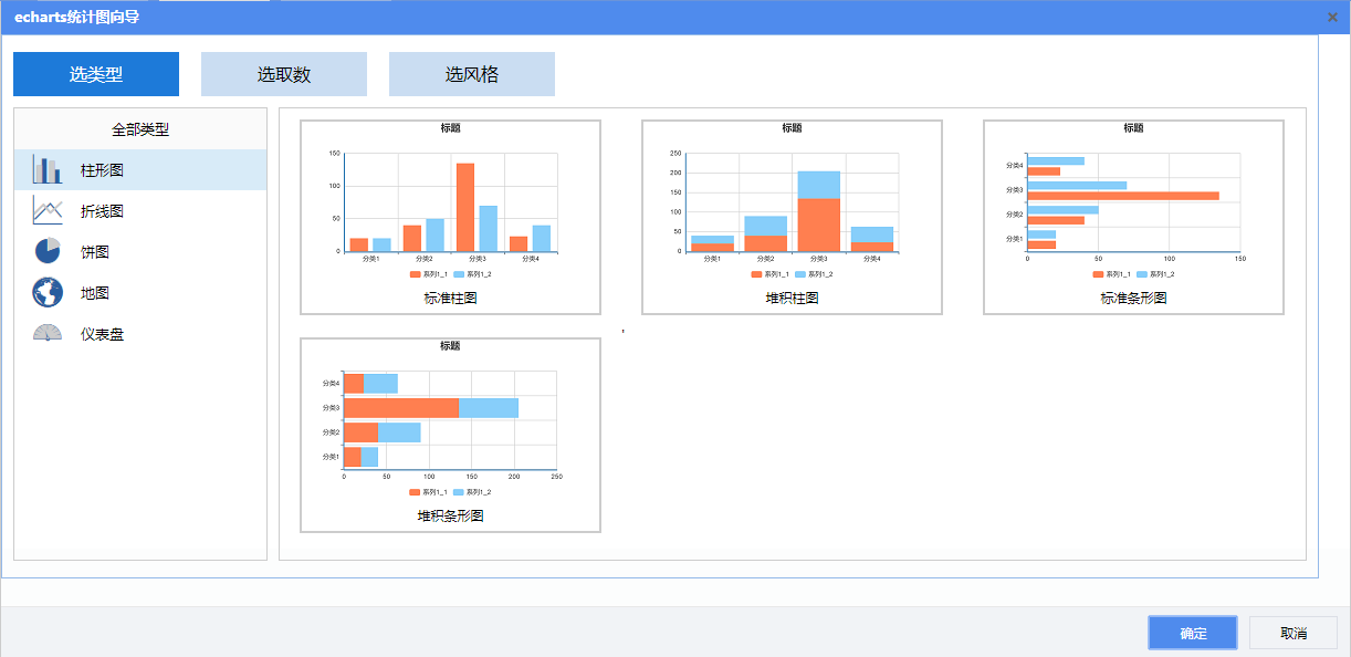 为当前单元格插入一个统计图,点击后进入到统计图定义向导界面。统计图分为传统的静态统计图和echarts统计图。
