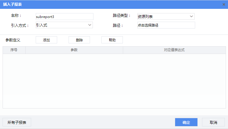 要为某个报表插入子报表时,选中要添加子报表的单元格,通过菜单工具栏上的【插入】-【子报表】,弹出子报表添加界面。如下图所示:
