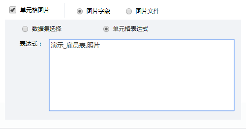 - 图片字段是图片存在数据库的某个字段中,设置为图片字段后可以通过读取该字段从数据库中取出图片显示在单元格中。分为数据集选择和单元格表达式两种。