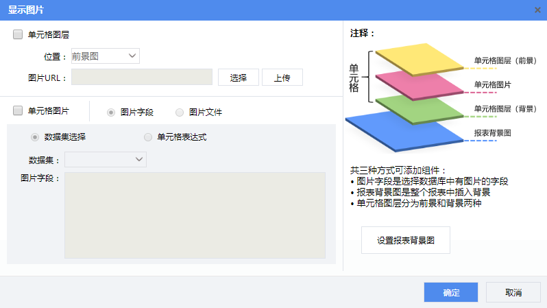 插入单元格图片、背景图可以设置单元格图层、单元格图片以及报表背景图,如下图所示: