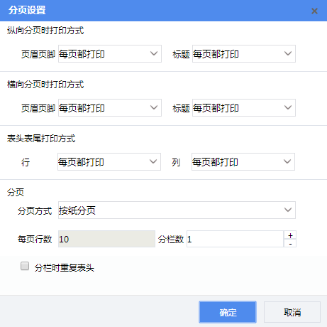 设置报表的分页方式以及分页时的打印方式。分页设置界面如下图所示: