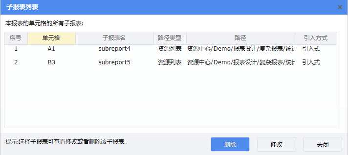 点击左下角的【所有子报表】按钮,可查看该报表设置的所有子报表,并进行修改和删除,如下图所示: