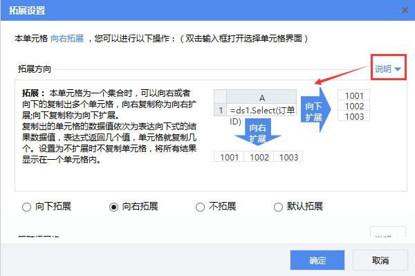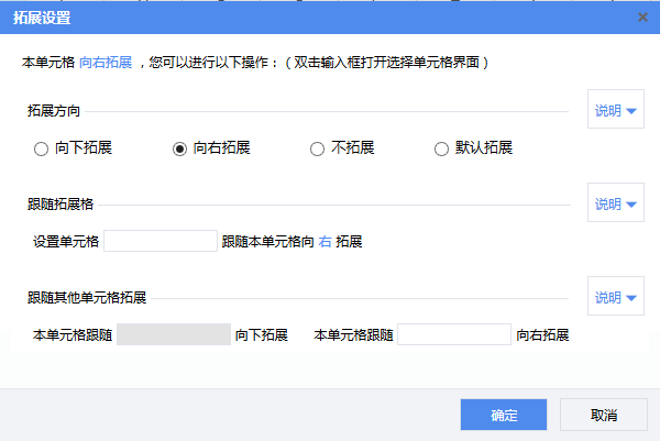 本菜单项的功能是用于设置某一单元格的扩展方向和跟随扩展属性。点击说明的下拉按钮可查看该项设置的说明。