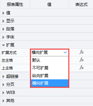 单元格的扩展方式属性分为默认、横向扩展、纵向扩展、不可扩展四种。当单元格的数据值表达式为集合表达式时,该单元格默认为可扩展单元格。计算结果为单值表达式时该单元格默认为不可扩展。当单元格为可扩展单元格时,可以默认扩展方向,也可以为扩展单元格设置一个扩展方向,扩展可以有横纵两个方向,即横向扩展和纵向扩展,但一个扩展格同时只能有一个扩展方向。