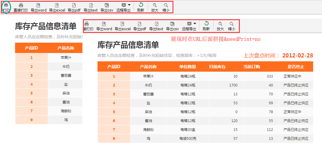 报表展现的属性还可以通过URL来进行设置,直接在URL后加上要设置的参数名及参数值即可。如在url中添加参数needPrint=no,隐藏打印按钮。