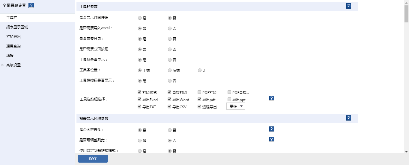 该功能模块为报表展现的参数提供友好的配置界面,该页面可配置的参数分为几大类:工具栏参数,报表显示区域参数,打印导出参数,通用查询参数,填报参数等。