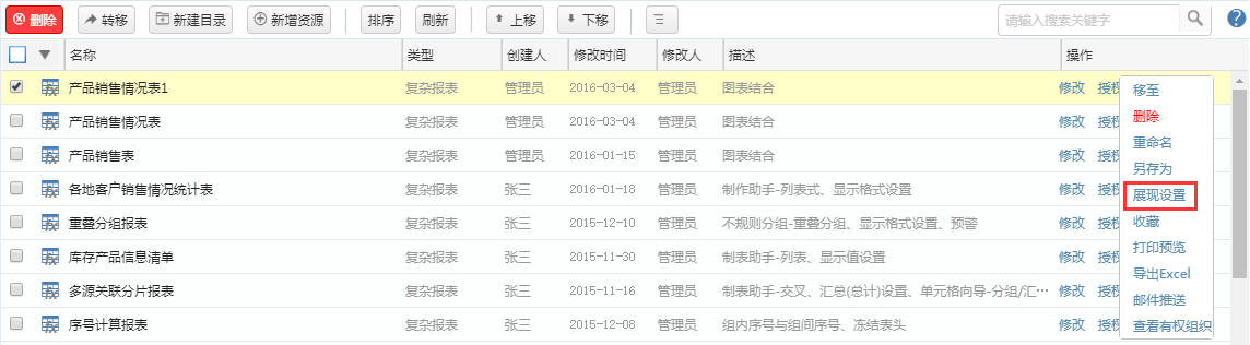 在【资源中心】下,报表资源操作列的【更多】操作中包含一个【展现设置】的按钮。点击即可设置该报表资源的展现参数、标签和展现所用模式。