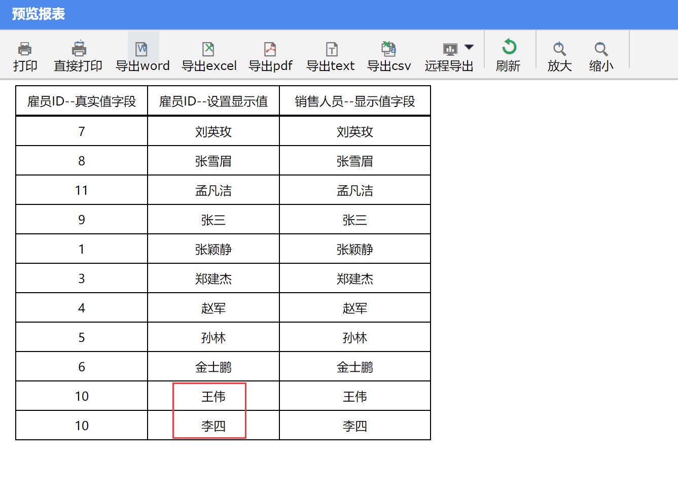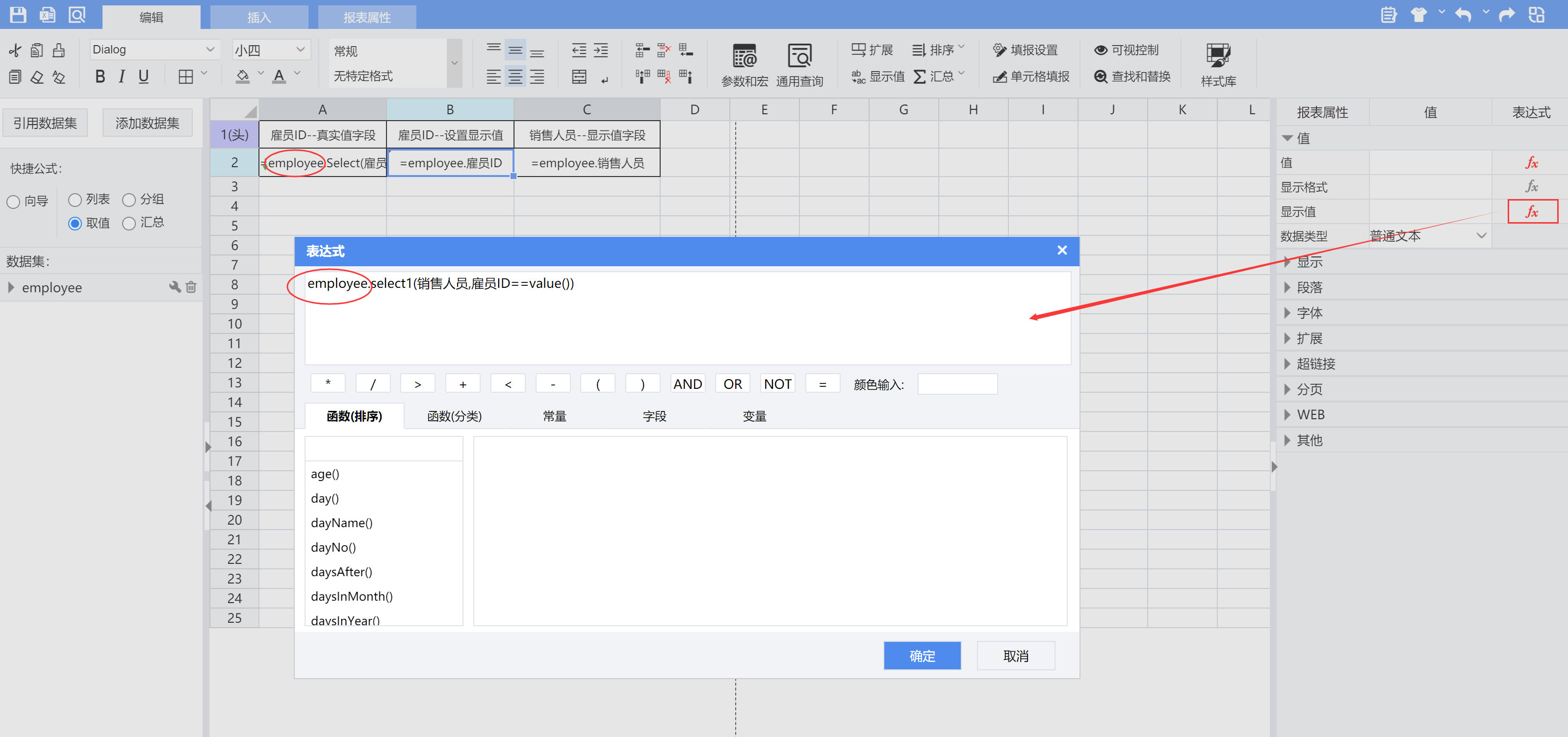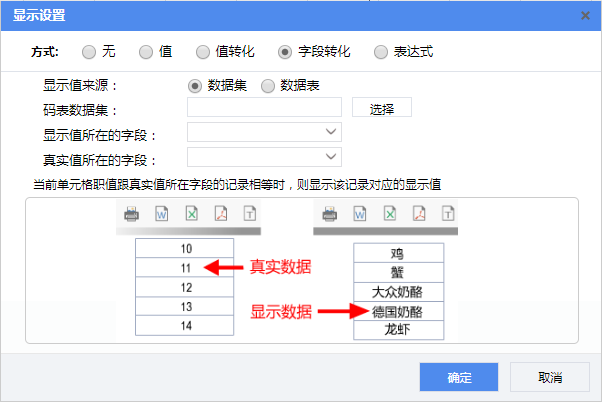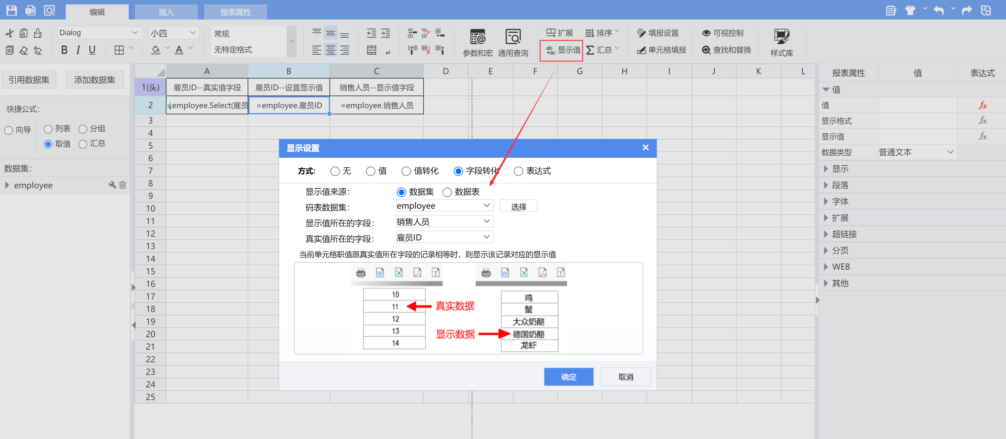 特别地,当码表中真实值不唯一,并且报表主体数据和显示值使用同一个数据集的情况下,建议设置显示值表达式,再右侧属性栏--显示值处使用select1表达式实现。工具栏中显示值--字段转化得原理是生成一个真实值与显示值的键值对,当真实值存在相同的值时,后面的值会覆盖前面的,可能会导致显示值不匹配。