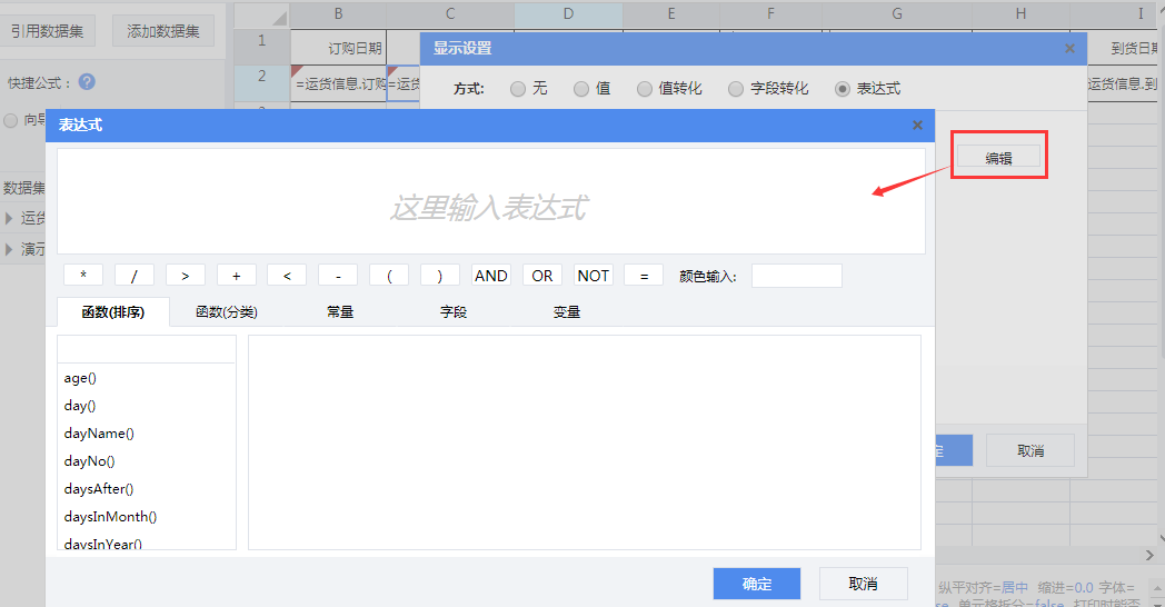 2.选中C2单元格,上方菜单栏选择【编辑】--【显示值】,选择表达式,在输入框内直接输入表达式,或者点击【编辑】按钮,进入表达式设置页面设置表达式。