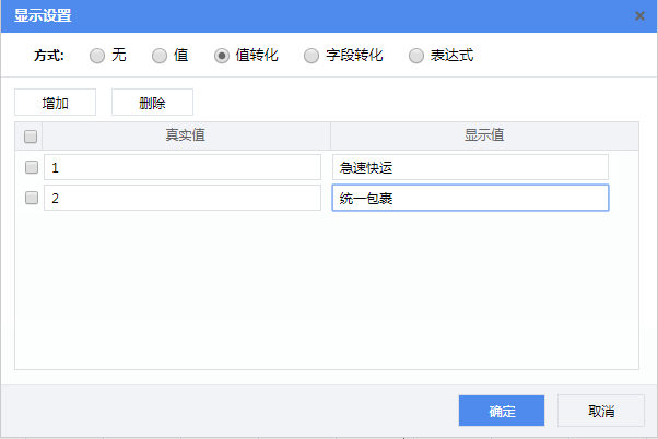 - 值转化:设置真实值和显示值的对应关系,例如运货商ID,"1"显示为"急速快运";"2"显示为"统一包裹"。设置界面如下图: