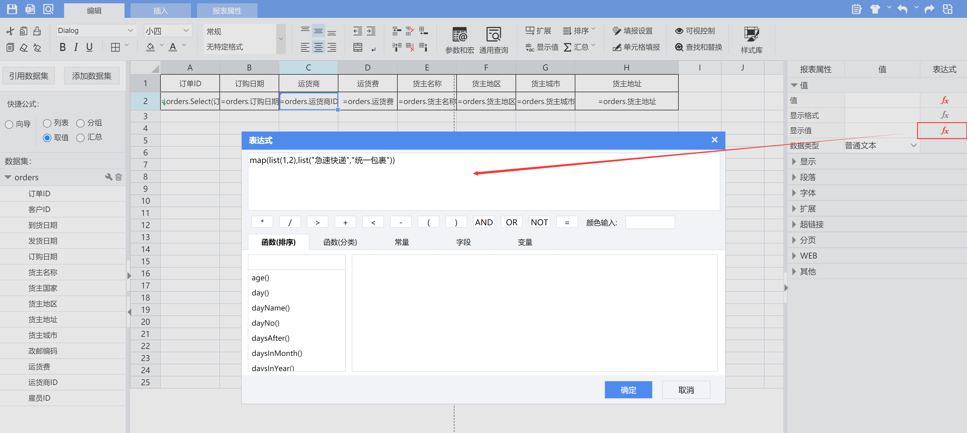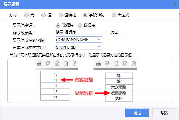 选中C2单元格,上方菜单栏选择【编辑】--【显示值】,选择字段转化,设置好显示来源为数据集,码表数据集为“演示 _ 运货商”,显示值字段为COMPANYNAME,真实值字段为SHIPPERID,点击【确定】。如下图所示: