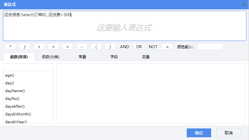 注意:表达式中取数字段“订单ID”和过滤“运货费>500”之间有两个逗号,因为不需要排序,第二个参数为空,但需要使用 , 占位。