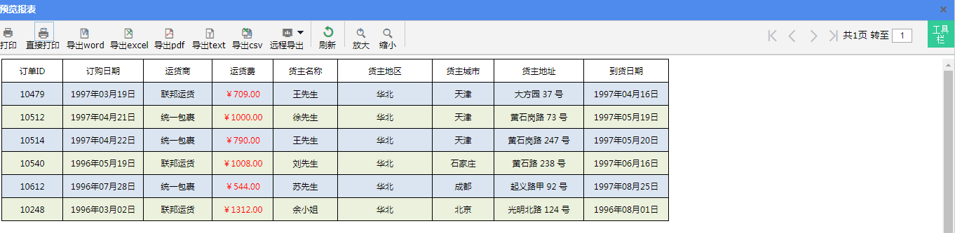 我们想从大量的数据当中,获取到符合条件的数据,例如在网格式报表中,仅展示运货费大于500的记录,如下图所示: