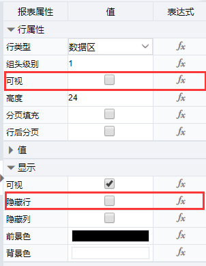 行属性中的可视:选中行时可设置。勾选且不定义表达式,当前行正常显示;不勾选且不定义表达式,当前行的内容和表格被隐藏;勾选或者不勾选,且定义表达式,当表达式执行结果为true时正常显示,false时当前行的内容和表格被隐藏。