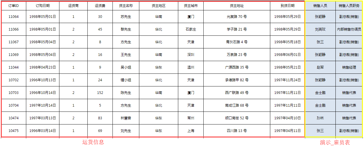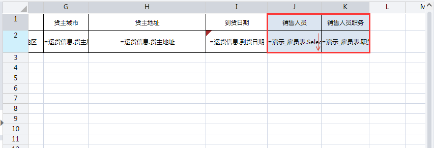 J2单元格表达式为:=演示 _ 雇员表.Select(销售人员,false,演示 _ 雇员表.雇员ID==运货信息.雇员ID),它的结果是数据集“演示 _ 雇员表”中字段"销售人员"对应的雇员ID与数据集中“运货信息”雇员ID相对应的所有值,由于这时返回的记录只有一条,所以不会扩展。