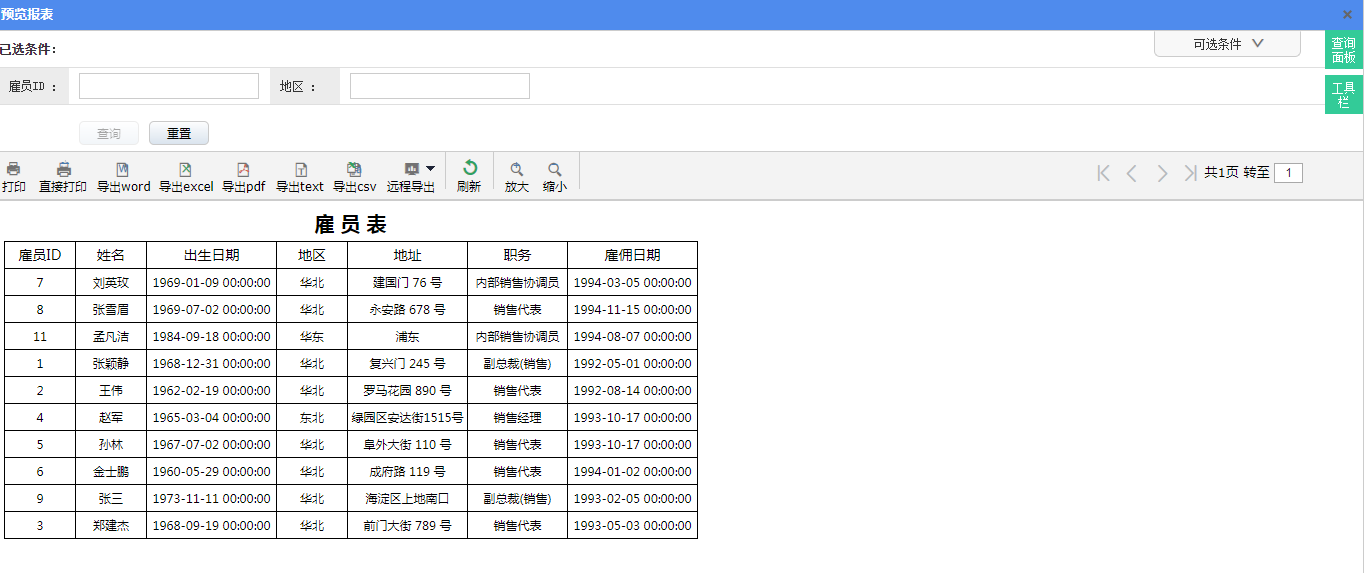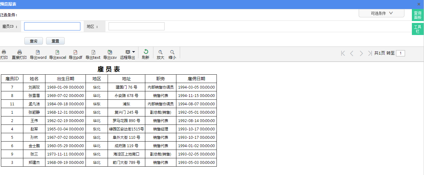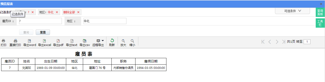 输入条件 雇员ID:7 地区:华北 , 点击查询按钮即可查看数据。