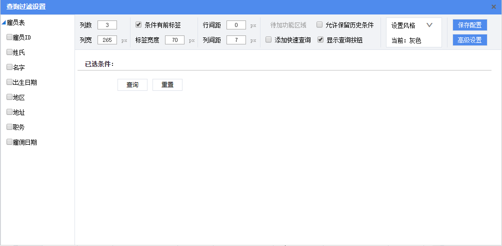 在左侧勾选需要做查询的字段“雇员ID”和“地区”。