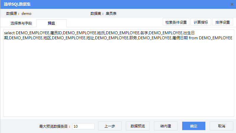输入数据集名称,点击【确定】,SQL检索数据集创建完成。