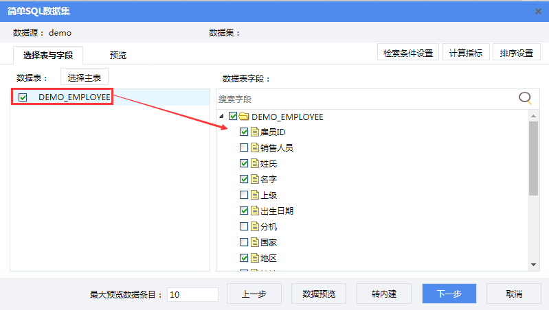 选择相应字段,也可以全选,点击【下一步】查看SQL,点击【确定】。