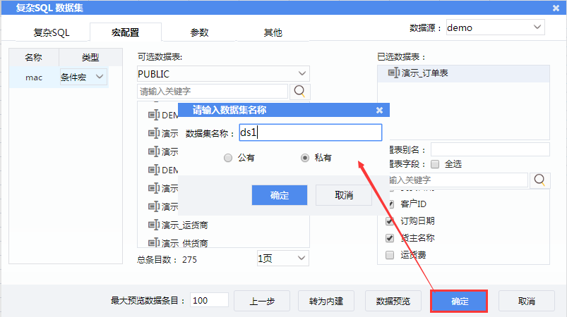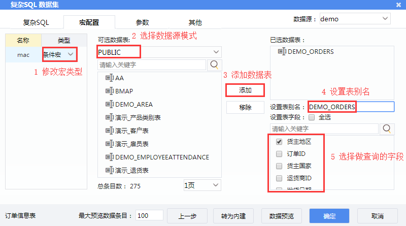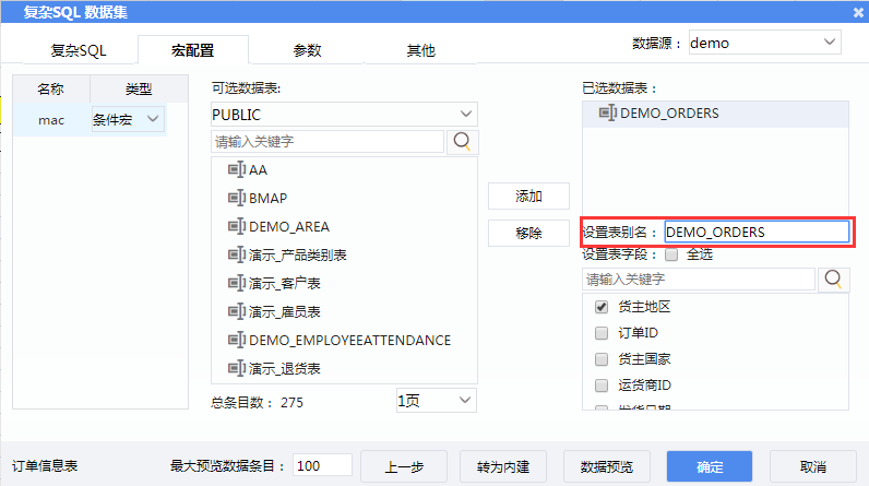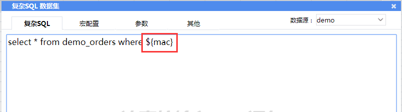 2)在数据集编辑页面输入SQL:select * from demo_orders where ${mac}