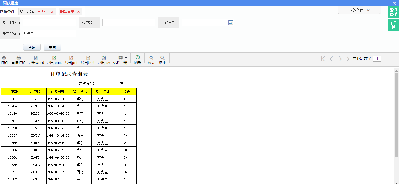 条件宏可以相当轻松的实现多个查询,而当某个查询条件为空则默认为1=1。此处条件宏可视为占位符使用,其后是将填入值的条件拼接在sql中 ,如上图四个条件假如都填则执行的sql便为select from demo_orders where 客户id=值 and 发行日期=值 and 到货日期 =值 and 货主名称=值 。中间以and连接,而上图只填入一个条件执行sql 为,可以视作select from demo_orders where 货主名称='方先生' and 1=1 and1=1 and1=1