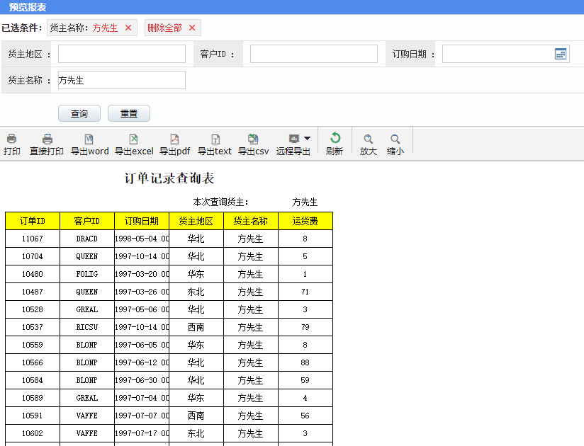 报表实现便捷多条件查询订单记录。