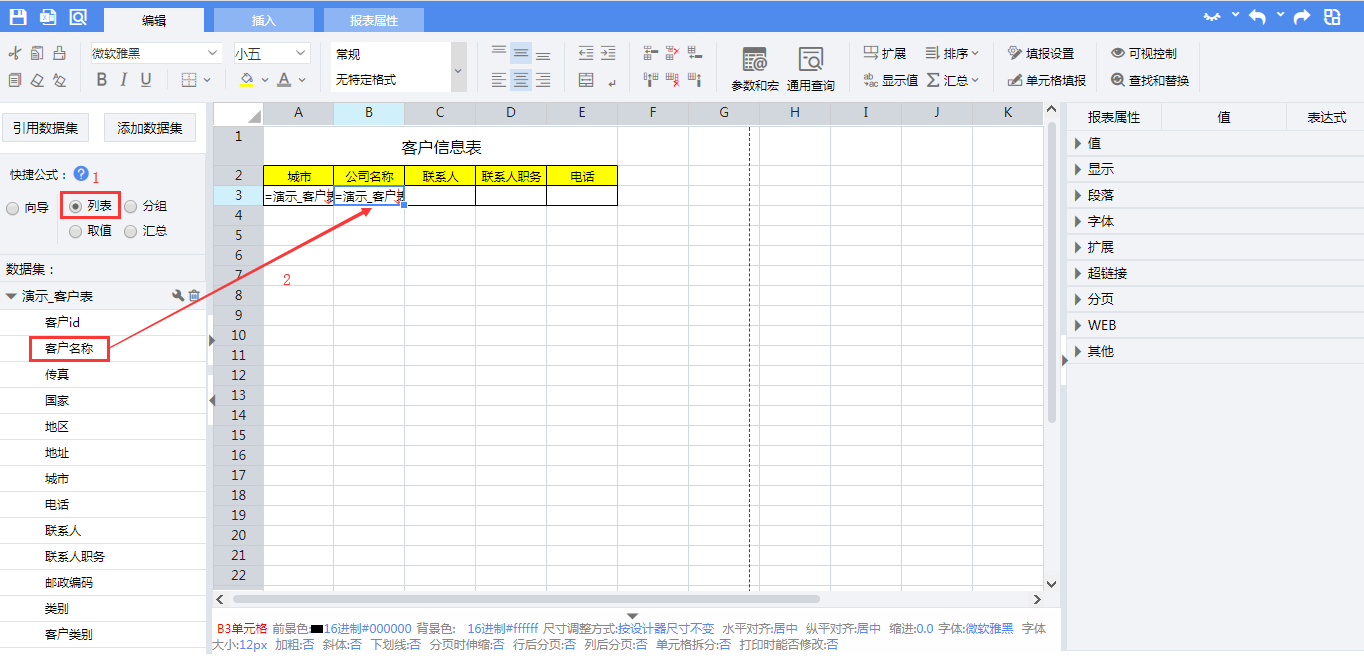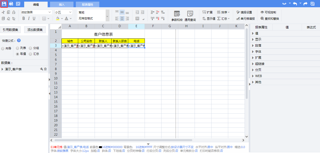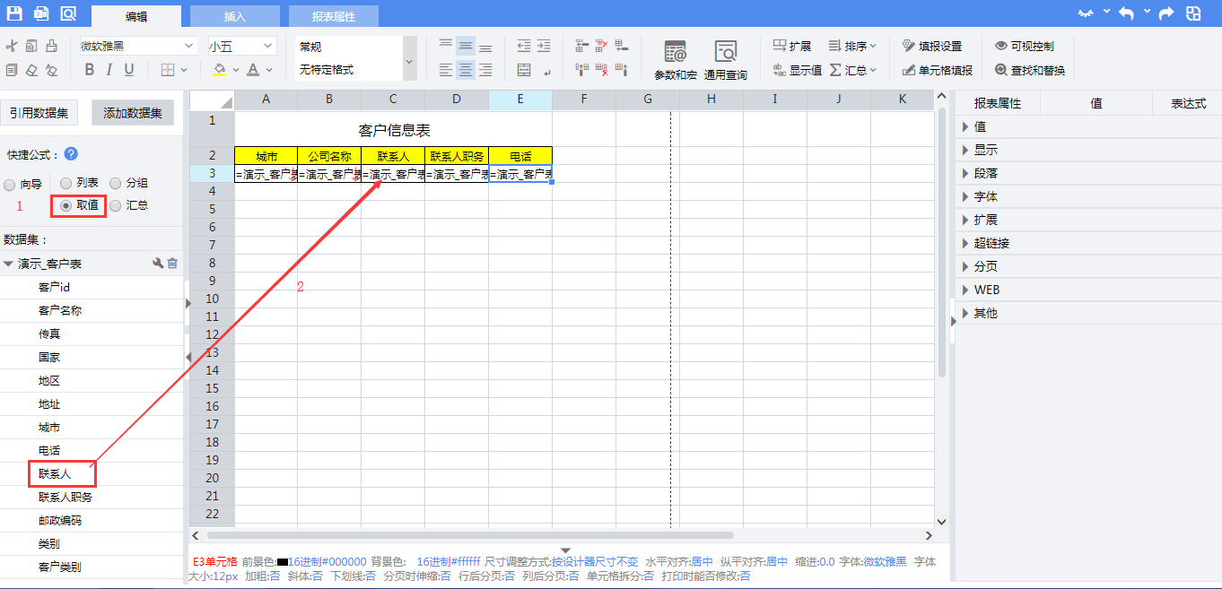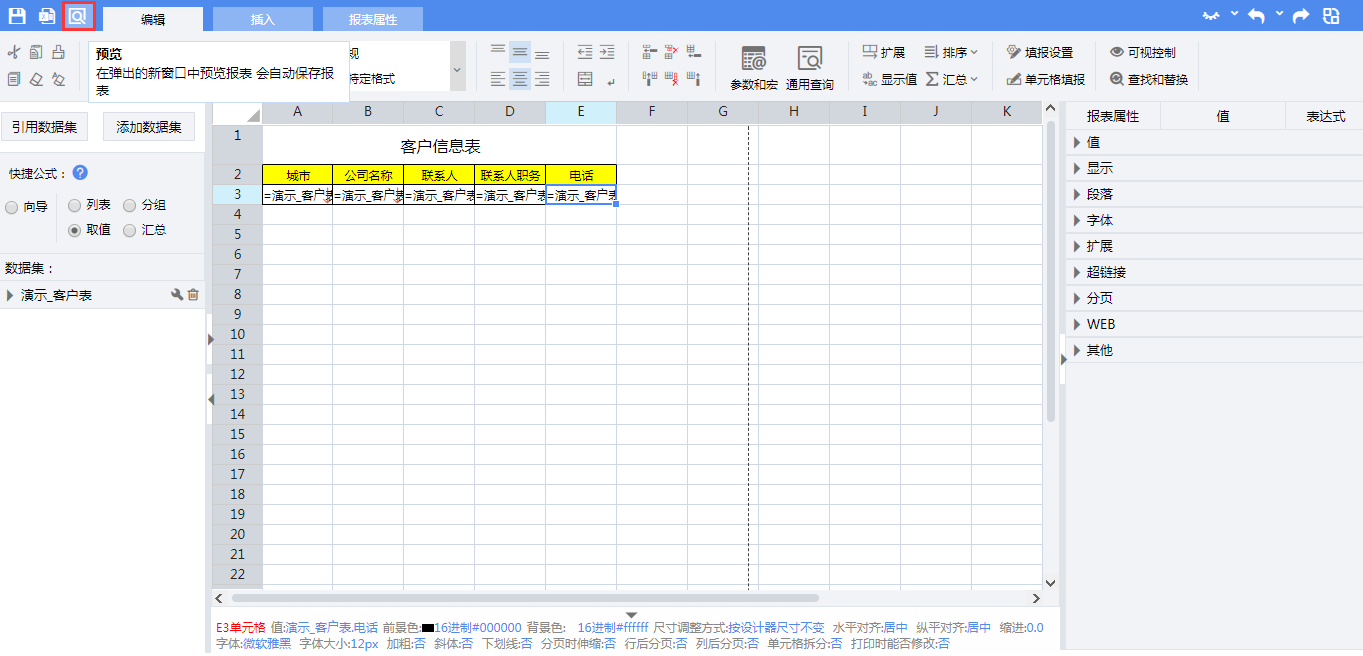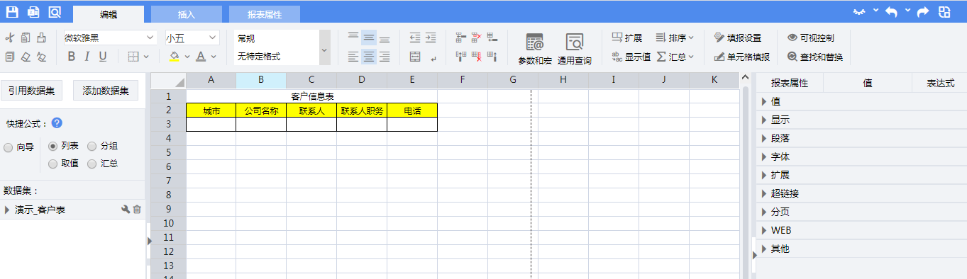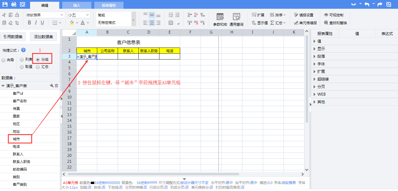 拖拽完成后,单元格内表达式分别为: A3:=演示_客户表.Group(城市,false) B3:=演示_客户表.Select(客户名称) C3:=演示_客户表.联系人 D3:=演示_客户表.联系人职务 E3:=演示_客户表.电话