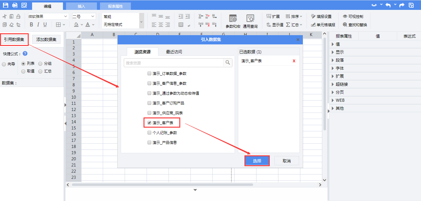 报表中的数据来自产品中自带的数据集“演示 客户表”。点击【引入数据集】按钮,在引入数据集页面,找到并勾选数据集“演示 客户表”,点击【选择】按钮 。