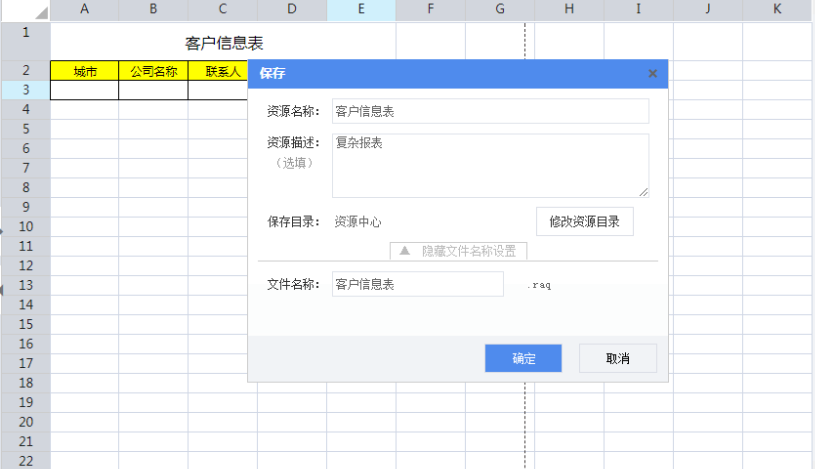 设置报表模板的名称和保存路径,点击【确定】,此报表模板保存资源名称为“客户信息表”。