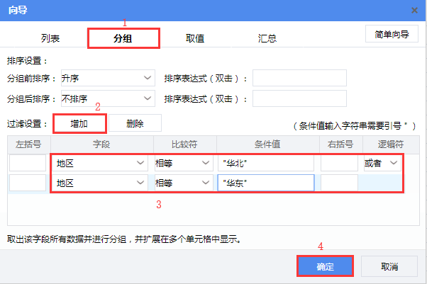 选择【分组】tab页,点击【过滤设置】后的【增加】按钮添加两个过滤条件并设置地区 等于 "华北" 或者 地区 等于 "华东",然后点击【确定】。如下图所示: