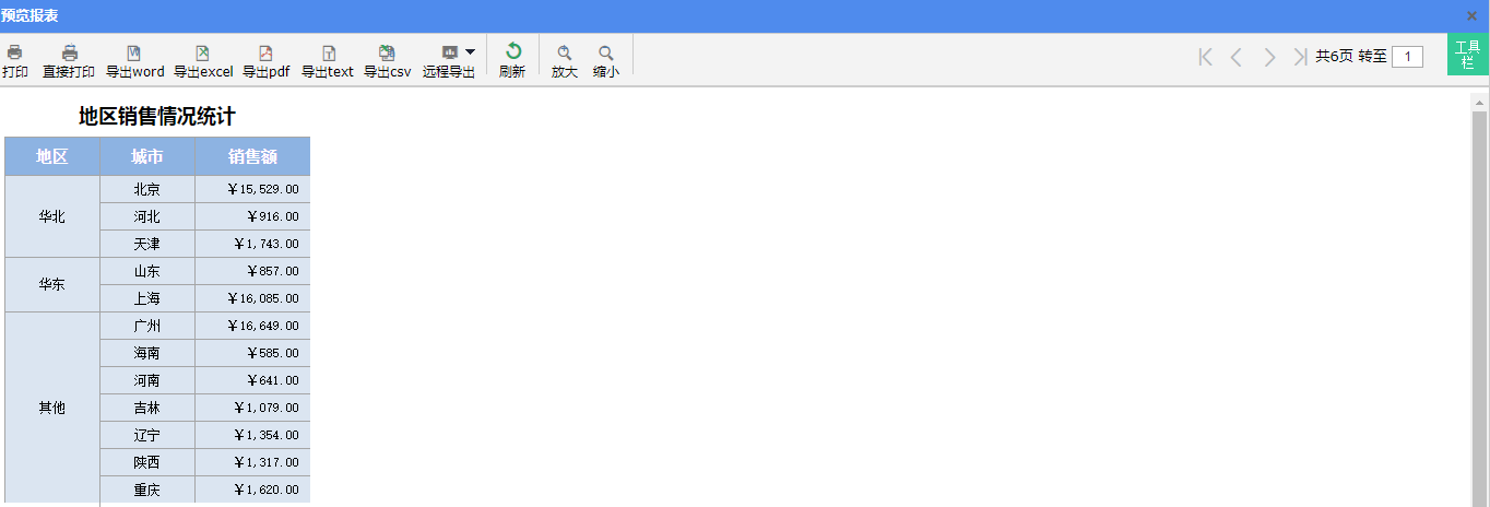 点击预览按钮对报表模板进行查看。预览页面如下图所示: