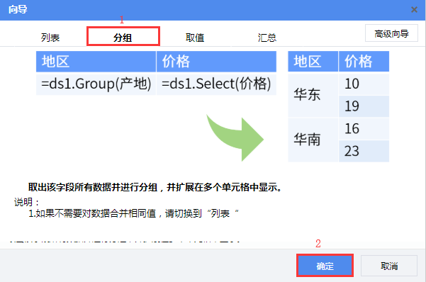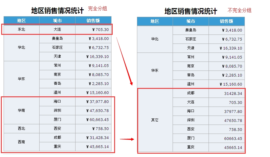- 报表第一列仅对数据集中的部分数据进行了分组,只保留了“华北”、“华东”这两个组,把剩余的组全部归并成一组,命名为“其他”。