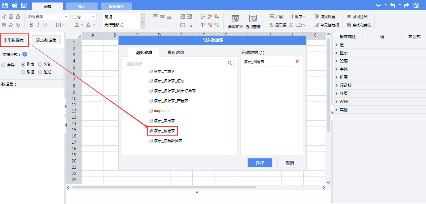 报表中的数据来自产品中自带的数据集“演示 销售表”。点击【引入数据集】按钮,在引入数据集页面,找到并勾选数据集“演示 销售表”,点击【选择】按钮。