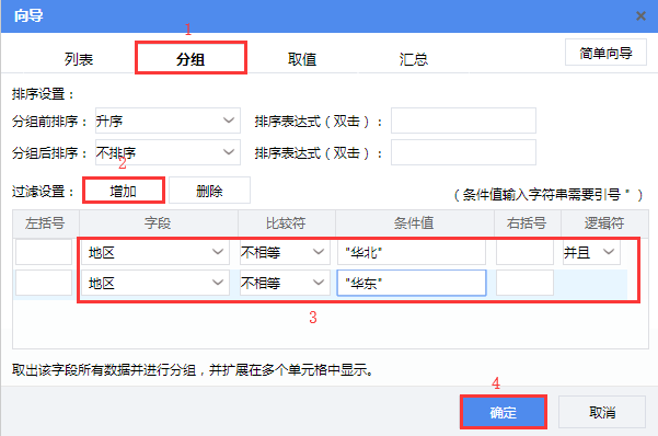 4)将“城市”字段拖拽至B4单元格,在弹出的单元格向导页面,点击右上角的【高级向导】切换至高级向导页面,选择【分组】tab页,点击【过滤设置】后的【增加】按钮添加两个过滤条件并设置地区 不等于 "华北" 并且 地区 不等于 "华东",然后点击【确定】。如下图所示: