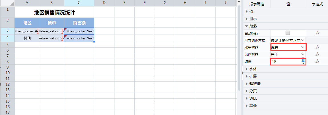 =demo_sales.Group(地区,false,地区=="华北" or 地区=="华东" ,,,)B3:=demo_sales.Group(城市,false)C3:=demo_sales.Sum(销售金额)B4:=demo_sales.Group(城市,false,地区<>"华北" and 地区<>"华东" ,,,)C4:=demo_sales.Sum(销售金额)