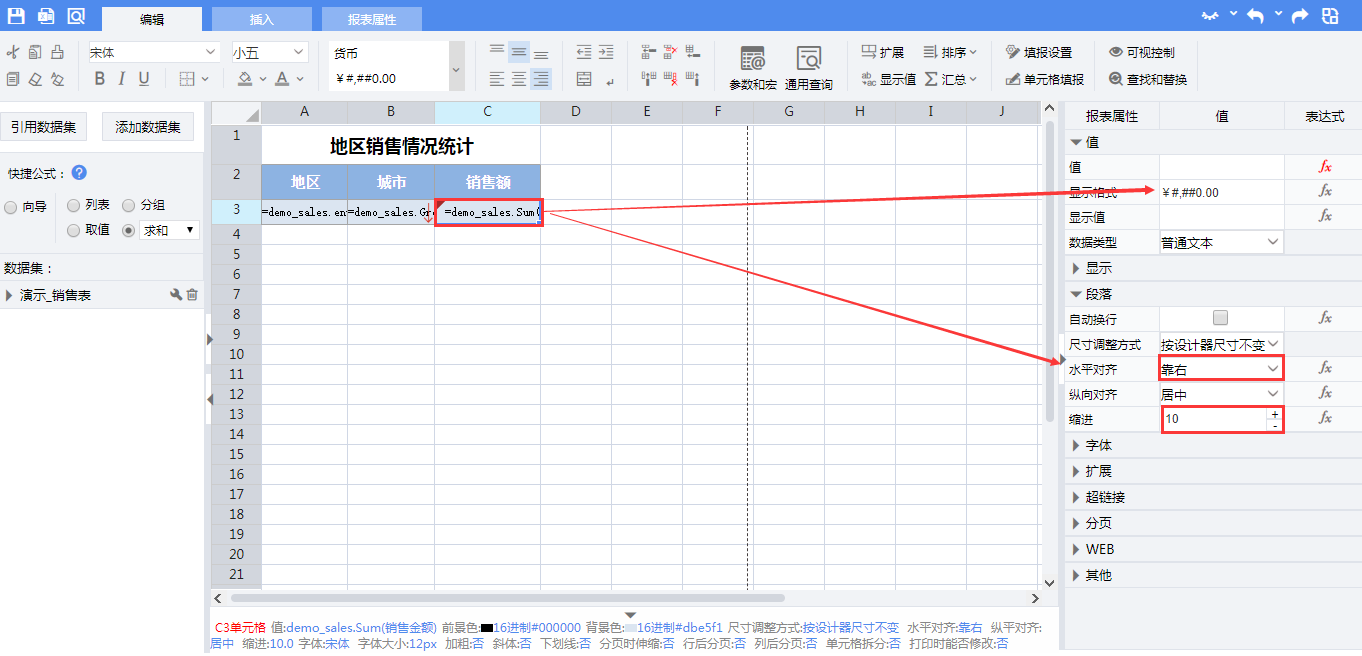 设置C3单元格的显示格式为¥#,##0.00,水平对齐方式为靠右,并设置缩进。