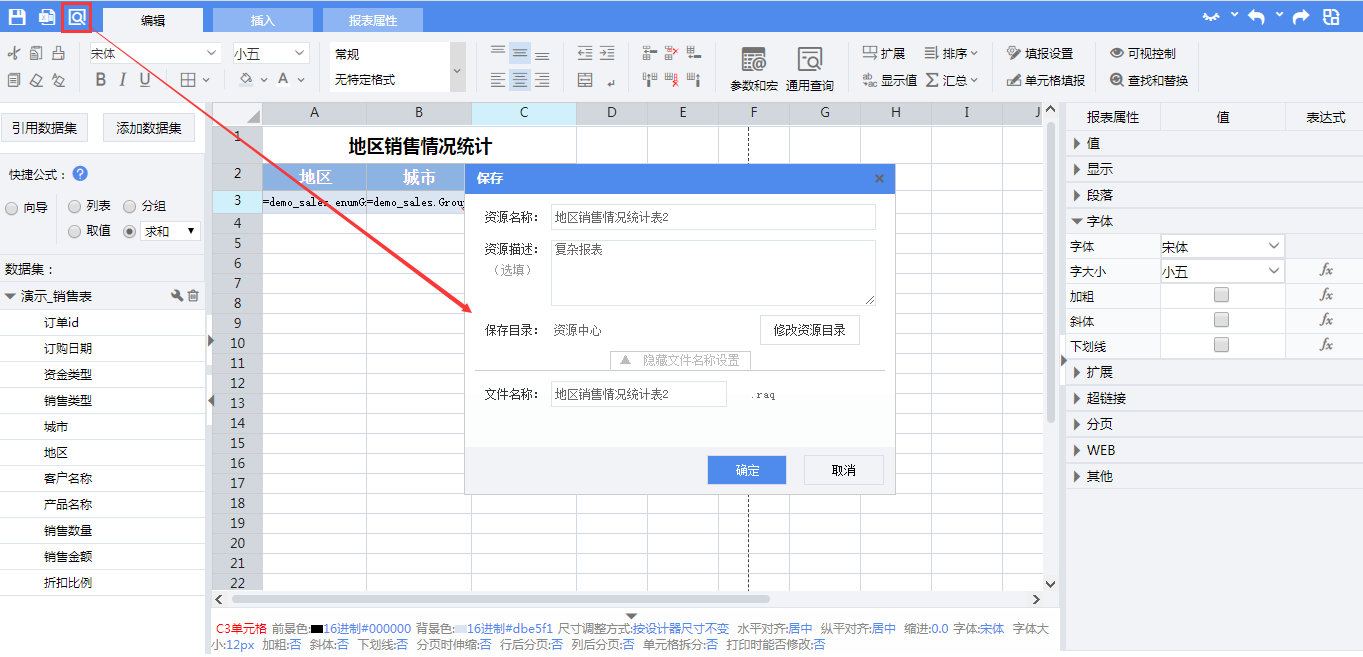 报表中的数据来自产品中自带的数据集“演示 销售表”。点击【引入数据集】按钮,在引入数据集页面,找到并勾选数据集“演示 销售表”,点击【选择】按钮