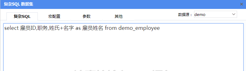 第二个数据集ds2从产品自带演示数据库中的“演示雇员表”取数,点击【添加数据集】,在新增数据集页面选择【复杂SQL】,在SQL编辑器里输入SQL语句,保存为“ds2”。SQL语法为:select 雇员ID,职务,姓氏+名字 as 雇员姓名 from demo employee