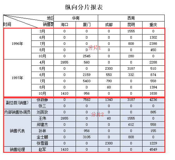 分片是指报表的纵向或横向或双向同时被分成了多个区域,每个区域独立扩展或者其中一个扩展区域为另一个扩展区域的子扩展区域,也可能是扩展区域和静态区域的混合。