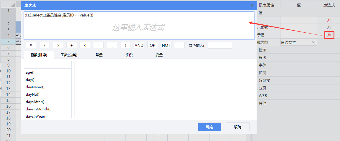 选中B5单元格,在右侧属性栏的显示值表达式窗口输入表达式:ds2.select1(雇员姓名,雇员ID==value())