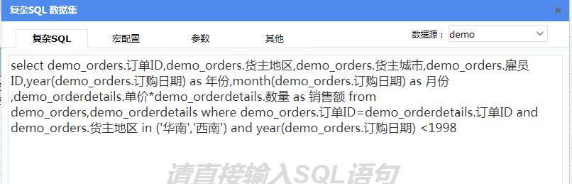 第一个数据集ds1从产品自带演示数据库中的“演示订单表”和“演示订单明细表”取数,与报表示例【多层交叉扩展】中的差别是,数据集中增加了一个“演示_订单表”的“雇员ID”字段,数据集sql语法如下: