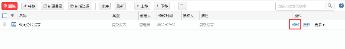 将上节中的“多层交叉扩展报表”另存为“纵向分片报表”,点击【修改】按钮,打开“纵向分片报表”。