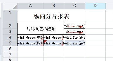 A5单元格表达式为:=ds2.Group(职务,false) B5单元格表达式为:=ds2.Group(雇员ID,false) C5单元格表达式为:=ds1.sum(销售额,雇员ID==B5)