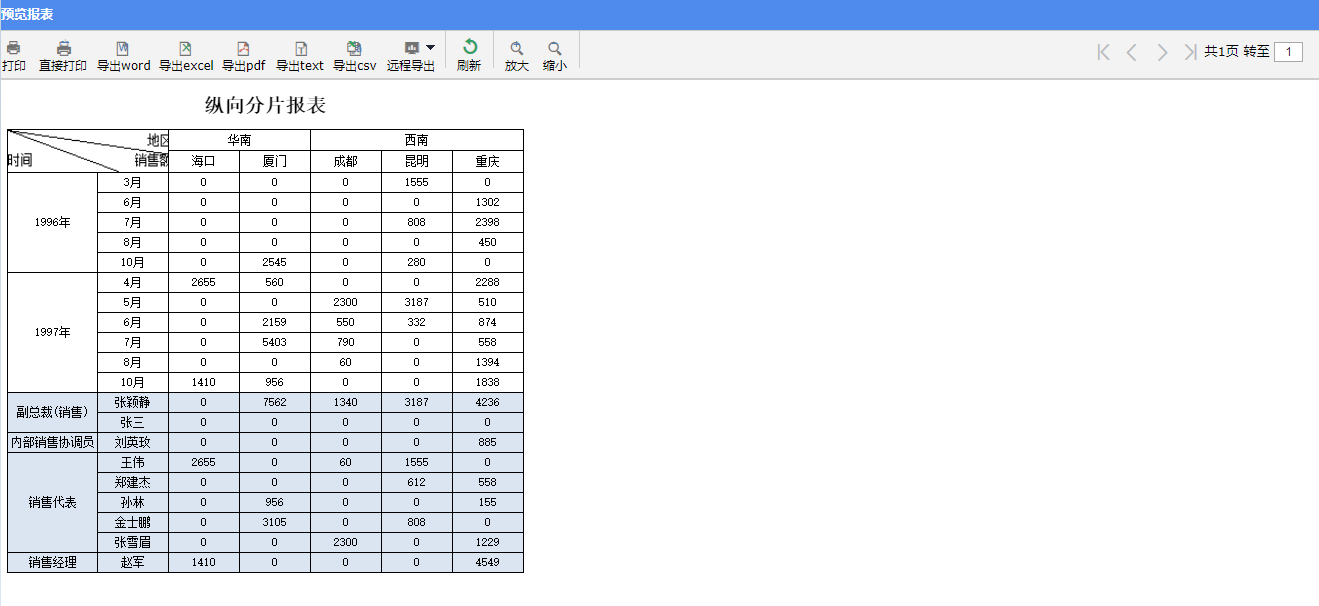 • 报表在纵向上可以划分成两片独立的扩展区域,例如上图示例报表的行表头中,上半部分按照一个数据集的年份、月份字段进行分组扩展的是一片区域,下半部分按照另一个数据集的销售职务、销售人员字段分组扩展的是另一片区域。