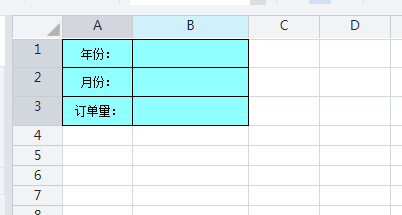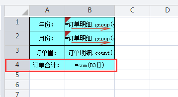 在A4单元格中输入“订单合计”,设置B4单元格的表达式:=sum(B3{})。