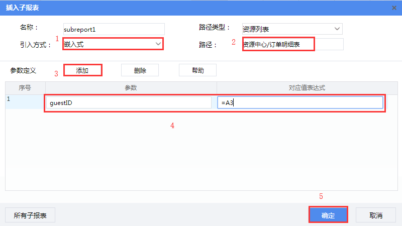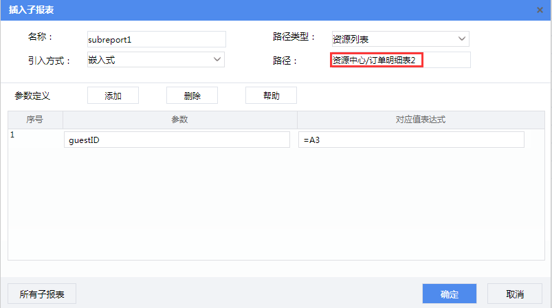 选中B3单元格,点击菜单栏【插入】-【子报表】,将“引入方式”设为“嵌入式”,“路径”选择子报表“订单明细表”。然后点击参数定义后的【添加】按钮添加参数,对应值表达式为:=A3,设置完成点【确定】按钮。