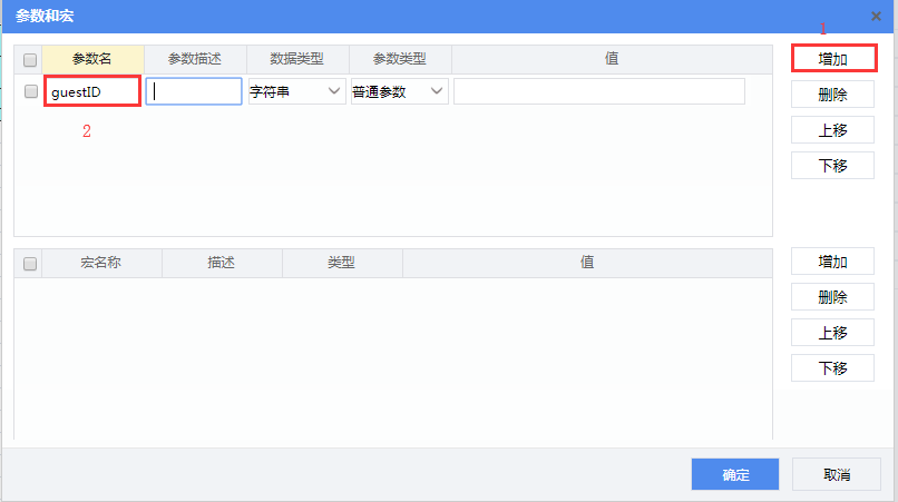 点击菜单栏中的【编辑】--【参数和宏】,打开参数设置页面,点击【添加】按钮添加参数,并修参数名为 guestID 。