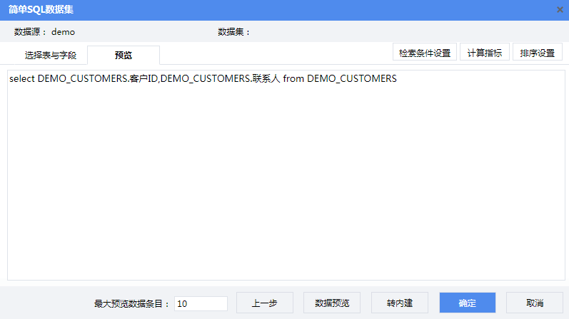 主报表中的数据集“客户订单”是从产品自带演示数据库的“演示 _ 客户表”取数,数据集sql语法如下: