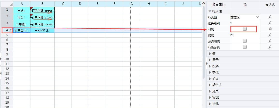 选中第4行,将第4行的可视属性的打勾去掉,这样预览时就不会显示第4行了。将第4行设为不可视,而不是删除,是因为主报表将引用B4单元格的值。